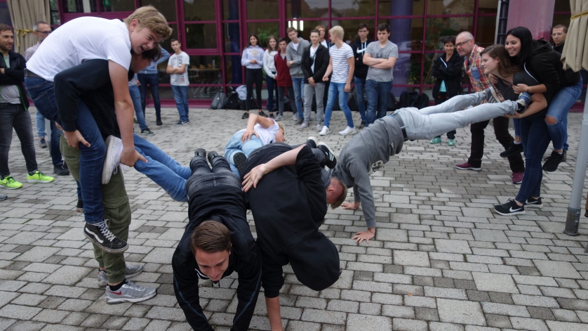 Zu Beginn des Freitags wurden wir in drei Gruppen aufgeteilt: in Chef, Abteilungsleiter und Arbeiter. Die Chefs mussten den Abteilungsleitern pantomimisch den Arbeitsauftrag darstellen. Anschließend erklärten die Abteilungsleiter diesen nur mit Worten, also ohne Gestik oder Mimik, den Arbeitern. Dies stellte sich zunächst als ganz schön knifflig heraus. Doch die anfänglichen Schwierigkeiten wurden mit etwas Geduld und Konzentration gemeistert. Nach weiteren kleineren Spielen, liefen wir zur Klingenburg. In neuen Gruppen überlegten wir uns auf dem Weg einen lustigen Sketch, welchen wir oben angekommen aufführten. Das nächste Spiel war an der Reihe: In drei Gruppen aufgeteilt mussten wir auf Holzklötzen den Weg über ein „eisiges Meer“ absolvieren. Dabei durfte jedoch der Boden nicht berührt werden, sonst musste ein Mitglied der Gruppe „erblinden“ oder uns wurde ein Holzklotz abgenommen. Als letzter Tagespunkt stand die Werksführung, im Werk 3 in Röllfeld, an. Dort haben wir viel Neues über die Temperaturmesstechnik gelernt.