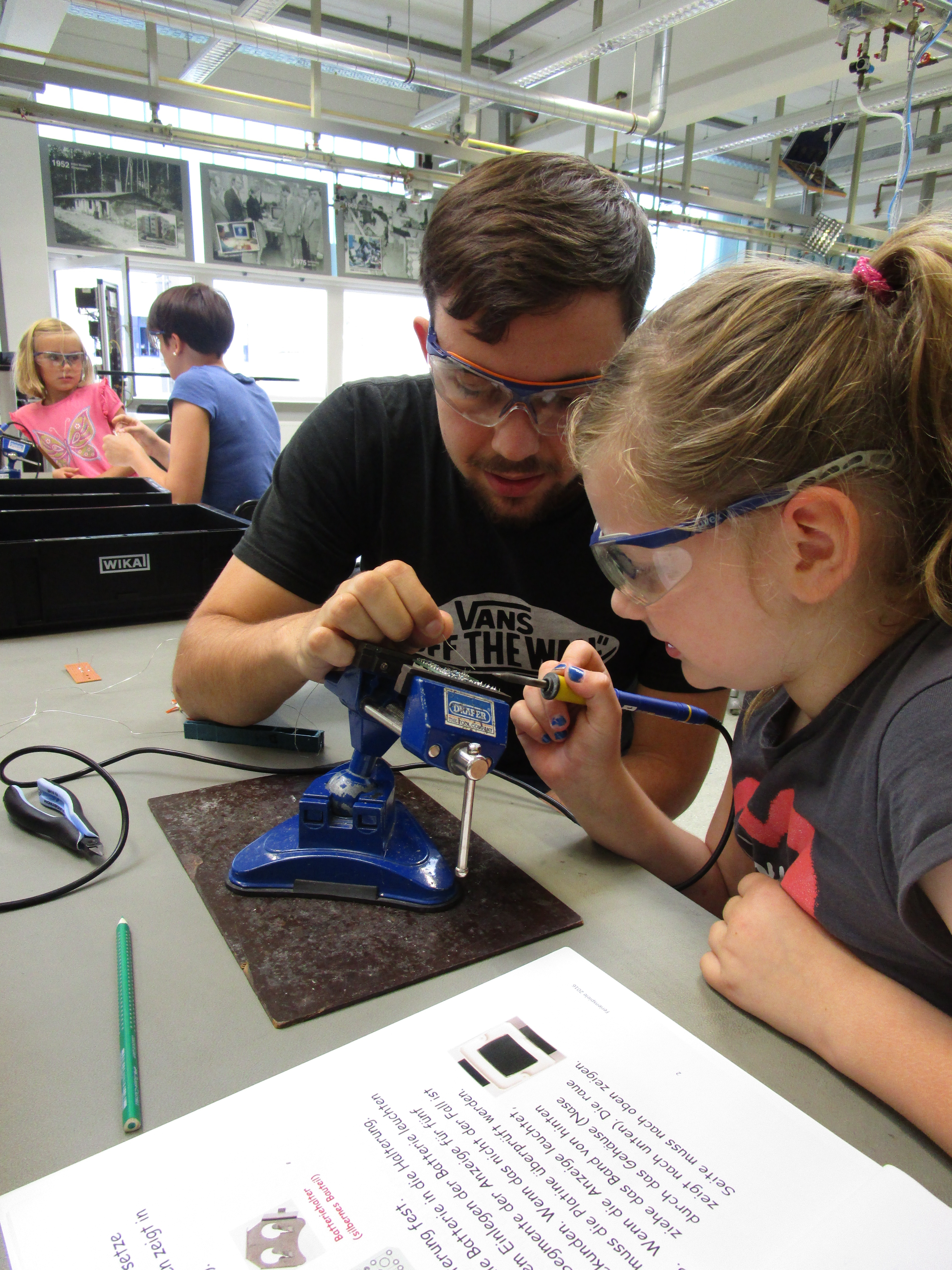 Voller Energie starteten die Kinder in den nächsten Tag – den Techniktag in der Firma. Zusammen mit den Auszubildenden durften die jungen Teilnehmer verschiedene Stationen in unserer Ausbildung durchlaufen. Neben dem Bau einer Uhr in der Elektronik, konnten sie in der Mechanik ein Leitergolf-Spiel bauen: Löcher bohren, Radius fräsen, Kugel erstellen und anschließend alles zusammenbauen, dabei haben sich die Kleinen ganz groß gefühlt.