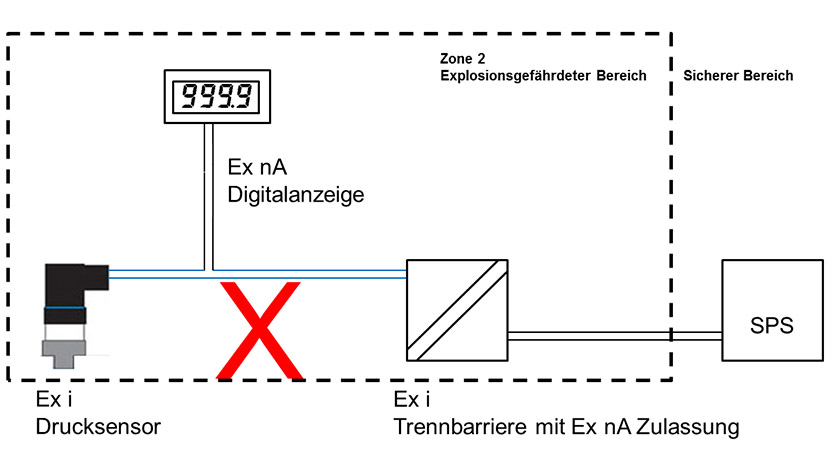 Jeder Ex i Sensor benötigt eine eigensichere Barriere zur Spannungsversorgung, damit die Zusammenschaltung als eigensicher gilt und die Vorteile, nämlich Wartungsarbeiten ohne Feuerschein durchzuführen, genutzt werden können. Digitalanzeigen werden häufig als passiver Teilnehmer mit oder ohne externe Stromversorgung direkt in das 4 … 20 mA Stromsignal eines Sensors integriert. Da eine Ex nA Digitalanzeige keine Ex i Leistungsdaten in ihrer Zulassung besitzt, kann aber ein Nachweis der Eigensicherheit nicht erbracht werden. Daher darf eine Ex nA Anzeige nicht in einen Ex i Stromkreis verbunden werden.