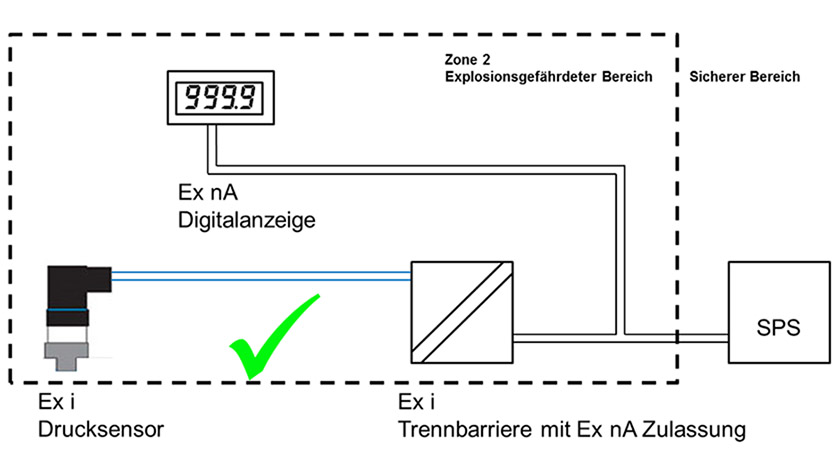 Es gibt aber dennoch die Möglichkeit eine Digitalanzeige mit einem Ex i Drucksensor in Zone 2 zu verbinden. Die Voraussetzung dafür ist, dass die eigensichere Trennbarriere ebenfalls eine Ex nA Zulassung besitzt und in Zone 2 installiert werden darf.