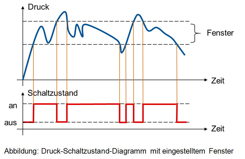 Im Gegensatz zur Hysterese überwacht die Schaltfunktion „Fenster“ statt einem folglich zwei Grenzwerte, eine obere und eine untere Schwelle (sog. „Fenster – high“, „Fenster – low“). Elektronische Schalter bieten in der Regel ein frei definierbares „Fenster“ nahezu über den gesamten Messbereich und lassen sich über eine externe Software bzw. ein Konfigurationsmodul oder über ein integriertes Display mit Bedientasten konfigurieren.