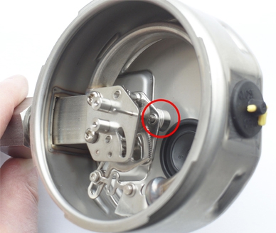 Abbildung 1: Blick in das Innere eines Manometers mit gedämpftem Zeigerwerk. Der Kreis markiert den Sitz des Topfs mit dem Silikonöl, der das Zeigerritzel aufnimmt.