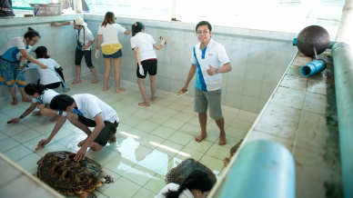 Zu dem Seminar, das abseits von Bangkok in der Küstenregion Rayong stattfand, gehörte aber auch eine soziale Arbeit: Die Kolleginnen und Kollegen unterstützten ein Schutzprojekt für Meeresschildkröten auf Koh Man Nai, indem sie die Becken für die Tiere reinigten.