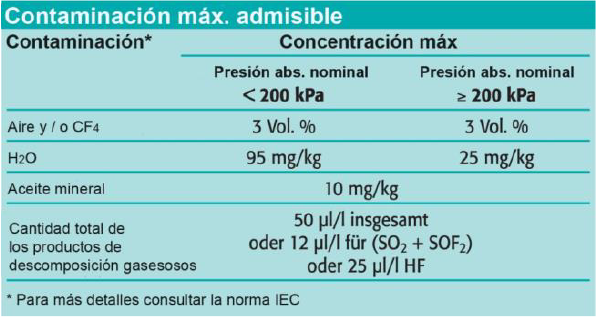 Los valores máximos de contaminación de están detallados en el Cigré SF6 Recycling guide. La normativa internacional IEC 60480 [5] a su vez está basada en estas recomendaciones del Cigré. En la práctica se establecen a menudo valores incluso más estrictos ya que las impurezas en gas SF6 pueden provocar efectos considerables a largo plazo.