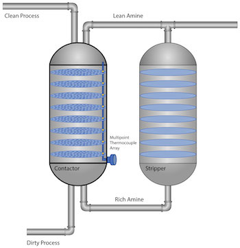 Un buen ejemplo de un proceso químico es la unidad de aminas, para la captura de carbono antes o después de la combustión. Este equipo – que se encuentra en refinerías, plantas de fertilizantes, instalaciones de gas natural licuado (GNL), etc. – se compone de dos columnas interconectadas (Figura 1). En la columna de contacto, el disolvente de amina entra en contacto con el gas de proceso y absorbe el CO2 y los compuestos del azufre. La solución de amina, ahora saturada de gases ácidos (mina rica), entra en la columna separadora, donde el vapor retira los compuestos no deseados para que la amina regenerada (amina pobre) pueda enviarse de nuevo a la columna de contacto para volver a utilizarse. Mientras tanto, los gases ácidos se envían a otras unidades para su posterior separación y refinado.
