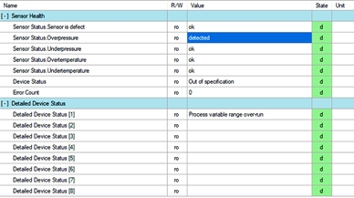 En este ejemplo, el estado del sensor se muestra de forma tabular. Los usuarios pueden ver inmediatamente y de forma inequívoca si hay un defecto o una discrepancia. La función de diagnóstico ofrece una visión general del estado en función de los siguientes parámetros: