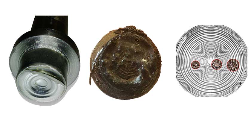 Las fisuras causadas por los picos de presión o las distribuciones de presión oscilantes (izquierda), una membrana dañada a causa de la contaminación del medio (centro) y una membrana con productos adheridos que pueden perjudicar el resultado de la medición (derecha)