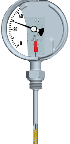 Principio de funcionamiento Para el control de proceso se aplican termómetros de los dos sistemas con contactos eléctricos que cierran y abren los circuitos eléctricos en función de la posición de la aguja del instrumento de medición. Los contactos eléctricos pueden ajustarse a través de todo el rango de medida.