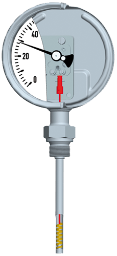 Principio de funcionamiento Para el control de proceso se aplican termómetros de los dos sistemas con contactos eléctricos que cierran y abren los circuitos eléctricos en función de la posición de la aguja del instrumento de medición. Los contactos eléctricos pueden ajustarse a través de todo el rango de medida.
