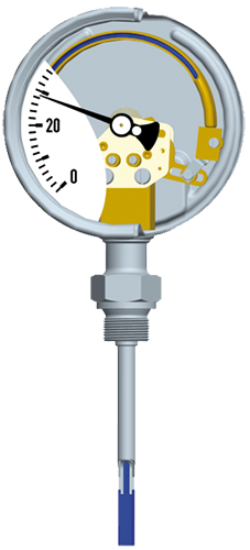 Mediante deformación mecánica de las cintas bimetálicas en las formas de muelle, frente a un cambio de temperatura se produce un movimiento de rotación. Si un extremo del sistema de banda bimetálica está sujetado en forma firme, el otro extremo hace girar el árbol portaíndice. Los rangos de visualización van de -70 °C a +600 °C con precisiones de clase 1 y 2 según EN 13190.
