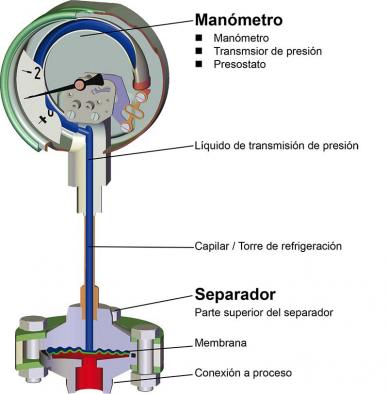 Para realizar una adaptación adecuada de la instrumentación a las condiciones de servicio se aplica una membrana de un material especial así como un líquido de transmisión específica en el interior del instrumento. La membrana flexible realiza la separación entre el medio y el instrumento. La presión ejercida sobre la membrana flexible se traspasa mediante el líquido de transmisión al elemento sensible del manómetro, transmisor de presión o presostato para la lectura de los valores. El montaje del separador puede efectuarse de manera directa al medio o mediante capilar flexible. Para resistir altas temperaturas se aplica una torre de refrigeración.