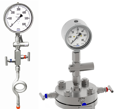 Izquierda: manómetro con protector de sobrepresión, válvula para separar el instrumento de medición del proceso y un tubo sifón que protege todo el sistema de medición de temperaturas excesivas.