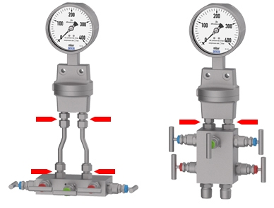 Mediante una solución con sistema hook-up o conjunto preensamblado, los usuarios se evitan los esfuerzos y riesgos potenciales descritos más arriba. El ensamblaje del sistema de medición se lleva a cabo en WIKA (en función de los parámetros de proceso especificados y las circunstancias de instalación) a partir de piezas individuales certificadas, y se realiza una prueba de fugas. Es entonces cuando está listo para instalar. En caso necesario, también es posible combinar un instrumento de medición con varias válvulas de instrumentación y accesorios.