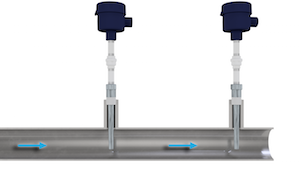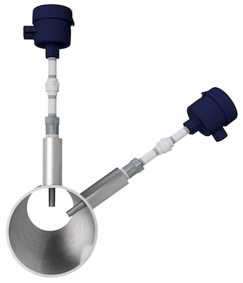 Ángulos de compensación – En este escenario, ambas vainas se instalan en el mismo lugar pero en ángulos de compensación uno del otro. Al tenerlas en el mismo lugar, no se ven influenciadas por la corriente ascendente o descendente de una instalación en línea. Deberían instalarse con un desfase angular mínimo para permitir una fácil instalación y retirada. Además, las puntas de las vainas deben estar lo suficientemente alejadas unas de otras para no influir en las lecturas individuales..