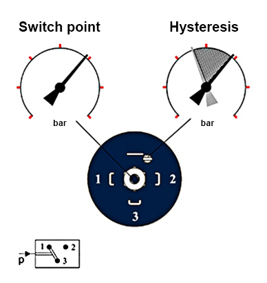 - Para finalizar, disminuya la presión hasta que el presostato vuelva a conmutar y vuelva a aumentar la presión para comprobar el punto de conmutación. Si es necesario, se debe corregir el punto de conmutación girando el tornillo de ajuste. Repita el procedimiento hasta alcanzar el punto de conmutación deseado.