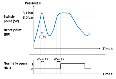 Fig. 1: Cómo reacciona a un perfil de presión un presostato con un tiempo de retardo ajustado.