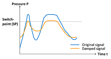El segundo de los ajustes de tiempo de un presostato es el tiempo de amortiguación. Puede ajustarse independientemente para la pantalla digital, las salidas de conmutación y la salida analógica. El tiempo de amortiguación hace que los valores medidos se promedien antes de mostrarse. En caso de rápidas fluctuaciones de la presión, por ejemplo, es posible estabilizar el valor medido mostrado en la pantalla y amortiguar la señal analógica.