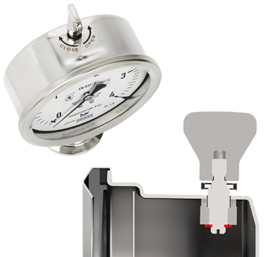 La nueva válvula de ventilación es claramente visible y está montada en la parte superior de la caja de los manómetros para facilitar el acceso. Se puede abrir o cerrar sin herramientas mediante una tuerca de mariposa. El sentido de giro, así como las posiciones de apertura y cierre, están claramente marcados en la caja. La tuerca y la junta de la válvula son de diseño higiénico. Un anillo de seguridad impide que la válvula se desenrosque.
