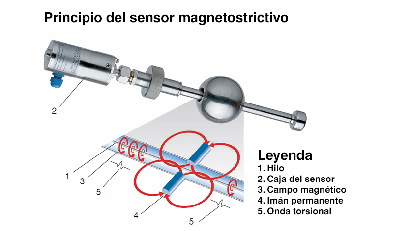 Sensor magnetostrictivo: Un impulso eléctrico genera un campo magnético. Si el campo entra en contacto con los imanes permanentes del flotador se crea una onda mecánica del cuál se mide la duración.