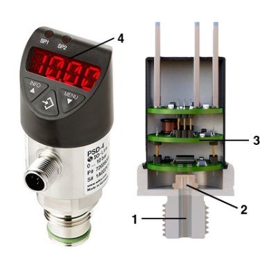 Un presostato eléctrónico con display modelo PSD-4, se compone de: Pantalla o display (4), placas de circuitos electrónicos impresos (3), sensor de medición (2) y conexión a proceso (1)