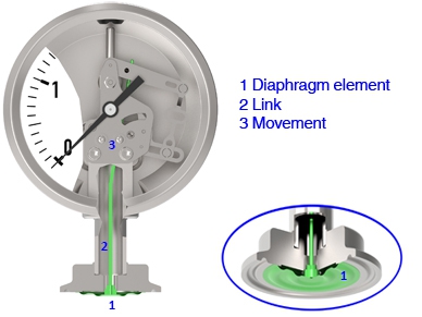 Le mécanisme d’un manomètre PG43SA avec élément à membrane affleurante