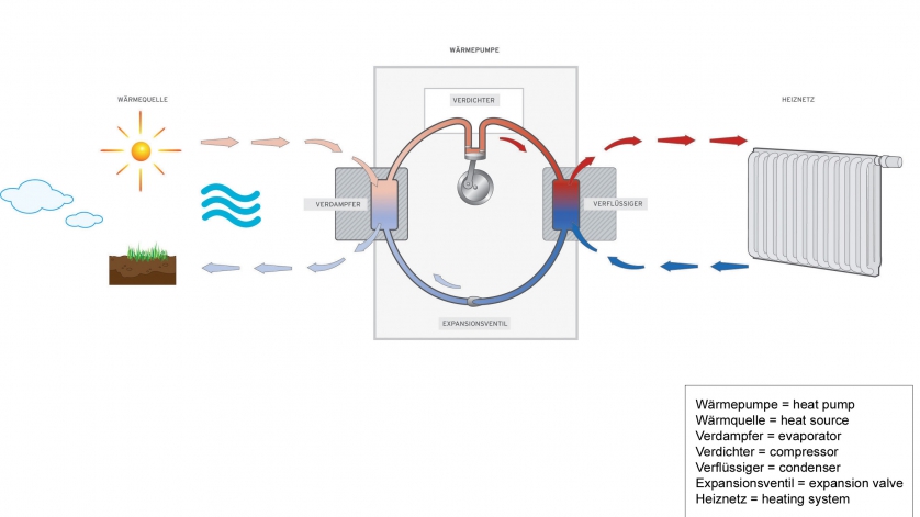 Le système fonctionne donc exactement en sens inverse. Dans ce but, la pompe à chaleur effectue la compression d’un gaz (comme dans le réfrigérateur) et libère ainsi la chaleur déjà présente dans l’environnement par évaporation.