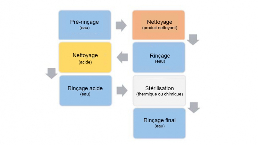 Le plus souvent, les process NEP sont entièrement automatiques et soumis à des timings et paramètres précisément définis. L’opération de nettoyage est réalisée avec plusieurs étapes bien arrêtées comme l’illustre le diagramme ci-dessus.
