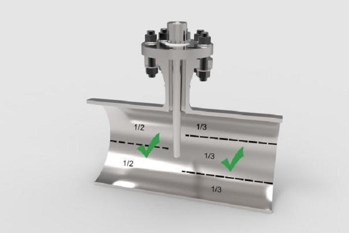 Le capteur doit toujours être positionné au milieu ou au tiers central du tuyau. De nombreuses normes spécifient des longueurs d’insertion minimales. Dans l’API RP 551-2016, par exemple, il est établi 50 mm comme minimum de base, ou 75 mm pour les thermomètres à résistance et bilame.