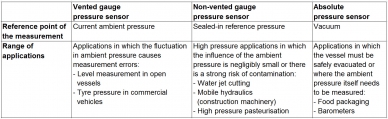 En cas de pressions très élevées (par exemple> 1000 bar), il devient de moins en moins important de savoir quel type de capteur est utilisé car l’erreur maximale de 1,23 bar ne conduit qu’à une incertitude de mesure de 1,23 bar / 1000 bar x 100% = 0,123%. Les domaines d’application décrits ici ne sont que quelques exemples sélectionnés parmi les domaines d’application parfois différents de chaque capteur et montrent que, dans chaque cas, les exigences de précision spécifiques et les conditions ambiantes doivent être prises en considération.