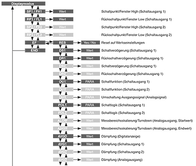 W przypadku obu opcji ustawień, elektroniczne przełączniki ciśnienia mogą być parametryzowane poza punktami przełączania. Na przykład, w PSD-4 dwa wyjścia przełączające mogą być ustawione niezależnie od siebie: jako normalnie zamknięte lub normalnie otwarte, z histerezą lub funkcją okna, jak również z czasem opóźnienia przełączenia i powrotu.