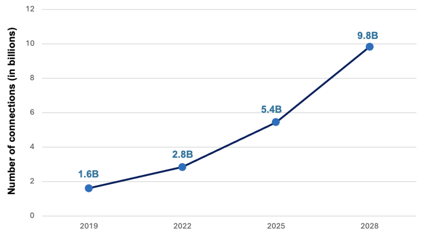 Fig. 1: Actual (2019, 2022) and projected (2025, 2028) number of IIoT connections globally